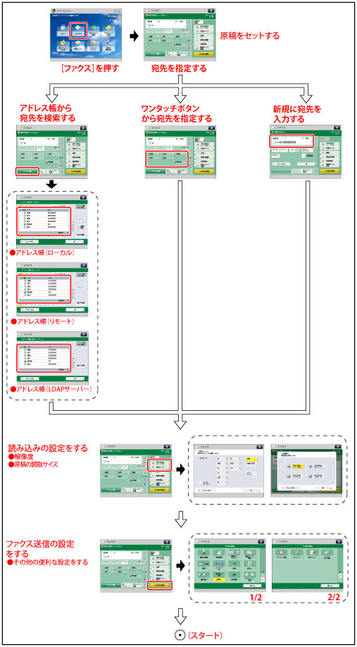 その他の機能を設定します。異なったサイズの原稿をいっしょに送信する場合や両面原稿を送信する場合など、便利なファクス送信機能を設定します。