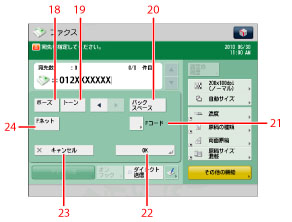 海外への送信のときに、国際電話識別番号などの次や、ファクス番号の末尾で押します。数字と数字の間で[ポーズ]を押すと「p」と表示され、数字の末尾で[ポーズ]を押すと「P」と表示します。(→ポーズキーの時間を設定する)