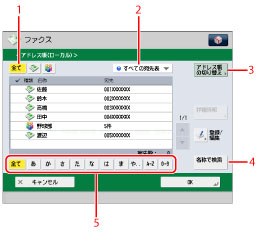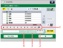[あ]、[か]、[さ]などの目次キーを押すと、その行の文字([あ]であればあ行)をポップアップ画面で表示します。ポップアップから選択すると、その文字でさらに絞り込みます。[全て]を押すと、絞り込まれた結果がクリアされて全ての宛先を表示します。