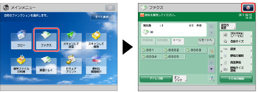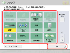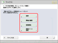 ファクス画面には、その他の機能のショートカットが4つ表示されています。デフォルトでは、「濃度」、「原稿の種類」、「両面原稿」、「原稿サイズ混載」になっています。このショートカットは、その他の機能から選択してよく使うものに変更することができます。