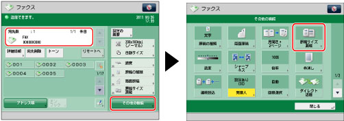 異なるサイズの原稿を送信した場合、受信側の記録紙サイズは読み込んだ原稿のうちの最大のサイズで出力されます。例えば、A3とB4の原稿を送信した場合は、受信側ではA3サイズで出力されます。