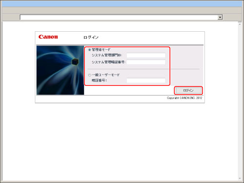 [管理者モード]を選択して<システム管理部門ID :>と<システム管理暗証番号 :>を入力し、[ログイン]をクリックすると、リモートUI、MEAPアプリケーション(ログインアプリケーションを含みます)にログインします。