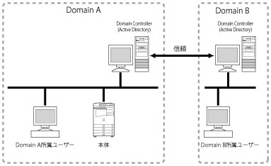 本体が含まれるDomain Aの所属ユーザーおよびDomain Aと直接双方向に信頼関係のあるDomain Bの所属ユーザーを認証できるほか、本体自身に登録されているユーザーを認証できます。ログイン先(ドメイン名または[このデバイス]) は、ユーザー自身がログイン時に選択します。