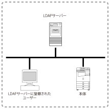 LDAPサーバーに登録/管理されたユーザーのほか、本体自身に登録されているユーザーを認証できます。ログイン先(LDAPサーバーのサーバー名または[このデバイス]) は、ユーザー自身がログイン時に選択します。