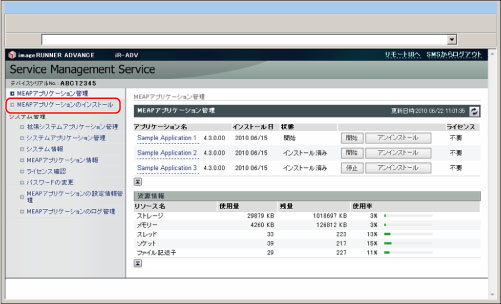 アプリケーションが使用しているハードディスク領域は、[MEAPアプリケーション管理]ページに表示される資源情報の「ストレージ」で確認できます。