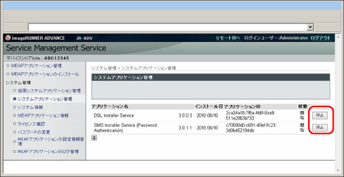 サービスを開始または停止するアプリケーションの[開始]/[停止]をクリック
