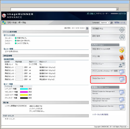 Remote UI Portalからログインするには、[管理設定](設定/登録)にある[ライセンス/その他]の[リモートUIのON/OFF]を「ON」にしてください。(→リモートUIを起動する前に(準備))
