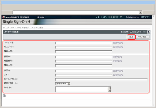 [設定するロール]で[Administrator]を選択すると、そのユーザー名とパスワードでローカルデバイス認証のユーザー登録/編集画面にログインできるようになります。