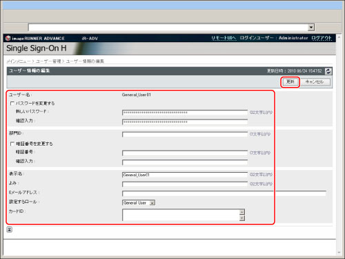 [ユーザー管理]ページでユーザー情報を登録/編集できるのは、ローカルデバイス認証の管理者のみです。一般ユーザーは、自分自身のパスワードのみ変更できます。