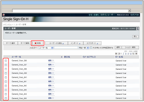削除するユーザー情報の先頭にチェックマークを付ける→[削除]をクリック