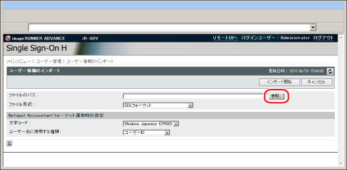 NetSpot Accountant 4.x/imageWARE Accounting Manager専用のフォーマットで作成されたユーザー情報をインポートします。ファイルの拡張子は「csv」です。