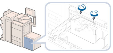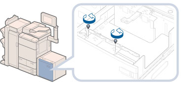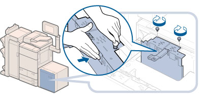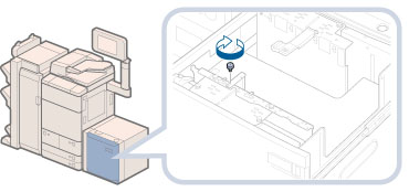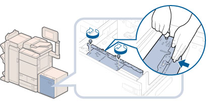 サイズ切替プレートの中央付近を押さずに青色の固定ネジで固定すると、プレートが斜めに固定されることがあります。そのまま使用すると、用紙が斜めに送られ、印字不良や紙づまりが起きる可能性があります。必ずサイズ切替プレートに手を添えて、奥側に押し付けながら固定してください。
