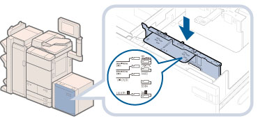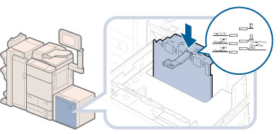 PODデッキライト・A1の場合は、サイズ切替プレートが、セットする用紙サイズの指標に正しくあっていることを確認してください。サイズ切替プレートが確実にあっていないと、PODデッキライト・A1が壊れる可能性があります。