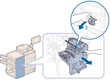 中とじユニット針ケースの交換を行う前に、製本トレイに排紙された用紙をすべて取り除いてください。