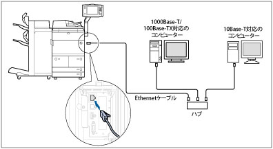 1000Base-T、100Base-TX、10Base-T対応の機器が混在しているときは、スイッチングハブなど、1000Base-T、100Base-TX、10Base-Tのすべてに対応した機器が必要です。詳しくは、お買い求めの販売店、または担当サービスへお問い合わせください。
