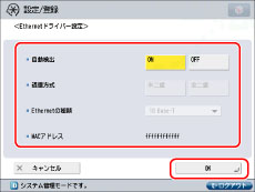 [ネットワーク]の[Ethernetドライバー設定]を押す→次の項目を設定→[OK]を押す