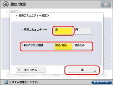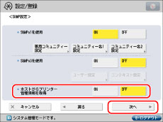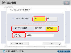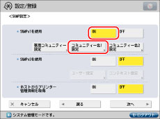 <SNMPv1を使用>の[ON]→[専用コミュニティー設定]を押します。<専用コミュニティー>の[ON]→<MIBアクセス権限>の[読込/書込]を押します。