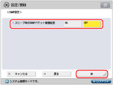 <スリープ時のSNMPパケット受信拒否> を「ON」にすると、キヤノン製ソフトウェア(imageWAREシリーズ)およびSNMP プロトコルを使用するアプリケーションから、本製品へアクセスできない場合があります。