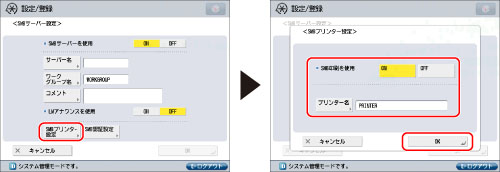 [SMBプリンター設定]を押す→SMBプリンターを設定→[OK]を押す