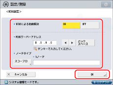 WINSの名前解決を使用するときは、<WINSによる名前解決>の[ON]を押します。[WINSサーバーアドレス]にWINSサーバーのIPアドレスを入力してください。