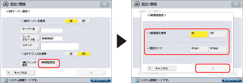 [SMB認証設定]を押す→SMB認証を設定→[OK]を押す