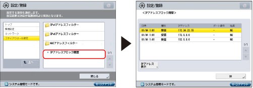 本製品とのデータ送受信を拒否するIPアドレスを設定した場合、そのIPアドレスを持つ機器と本製品間でデータを送受信しようとしたとき、ブロック履歴が残ります。また、データ受信のときは、IPアドレスとともにポート番号のブロック履歴も残ります。