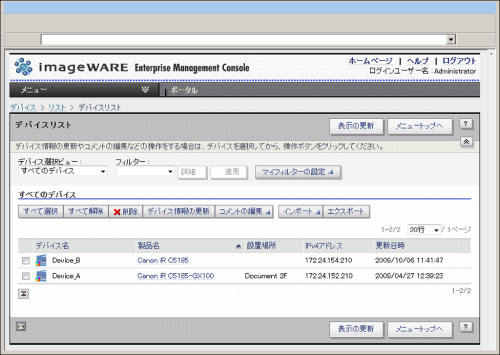 ネットワークに接続されている複数の印刷デバイスをWebブラウザー上で一元管理できます。ネットワーク上のデバイスから取得した情報(ネットワーク設定、状態、設置場所など)を一覧表示したり、デバイスの状態変化を管理者にメールで通知したりできます。複数のデバイスに対して、各種設定を一括で行うこともできます。