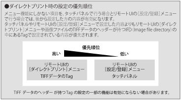 メニュー機能とアプリケーションソフトやプリンタードライバーとで同じ設定項目がある場合には、アプリケーションソフトやプリンタードライバーで設定した内容の方が有効になります。また、メニュー機能にしかない項目を、タッチパネルで行う場合とリモートUIで行う場合では、後から設定した方の内容が有効になります。