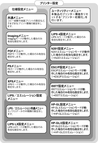 各動作モード(LIPS LX、LIPS IV、N201、ESC/P、I5577、HP-GL、HP-GL/2)の設定をします。LIPS、N201、ESC/P、I5577、HP-GL、HP-GL/2の各モードに共通の「LIPS/エミュレーション共通メニュー」と専用の「LIPS LX設定メニュー」、「LIPS4設定メニュー」、「N201設定メニュー」、「ESC/P設定メニュー」、「I5577設定メニュー」、「HP-GL設定メニュー」、「HP-GL/2設定メニュー」があります。
