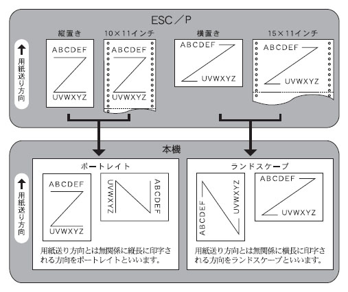 ESC/Pプリンターはカット紙や連続用紙に印字できます。印字方向は常に一定ですから、カット紙を縦置きや横置きにすることで縦長(ポートレイト)または横長(ランドスケープ)の文書を印字します。