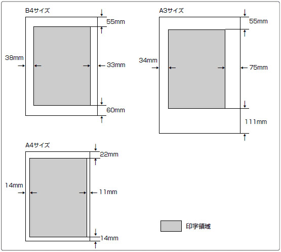 ただし、A3、B4サイズの用紙を使用しても、A4サイズのときと同じ縮小率で印字され、用紙のほぼ中央にレイアウトされます。