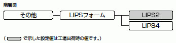 LIPSは上位互換であり、LIPSII+とLIPSIVでは基本的な機能は共通しますが、LIPSII+でしか使用できない機能(たとえばシリアルプリンターでの動作をエミュレートしたイメージ描画など)を使用するときにLIPSのモードを切り替えてください。この設定項目は、その他のグループの「HEX/LIPS機能」が[有効]に設定されている場合のみ設定することができます。