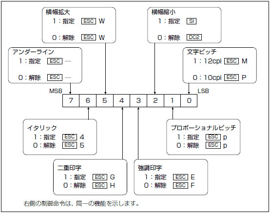 1バイトのビット0から7でそれぞれの印字モードを指定します。