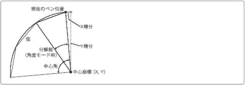 円弧は、直前のペン状態(UP/DOWN)と現在のペンの種類で描かれます。