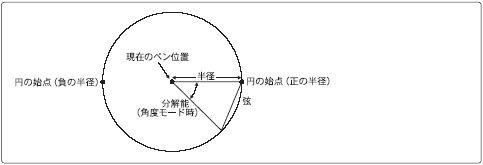円の半径を指定します。円プロットの開始点は、半径が正の値のときは現在のペン位置から見て0度、負の値のときは180度の位置になります。
