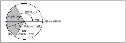 扇形の中心角を指定します。正の値を指定すると円周上の始点角の位置から反時計方向、負の値を指定すると時計方向に描きます。