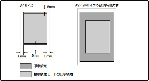 A4サイズでは、標準領域モードでページフォーマットの印字領域と用紙の有効印字領域にあまり差がないため、ワイド領域モードにしてもあまり効果がありません。