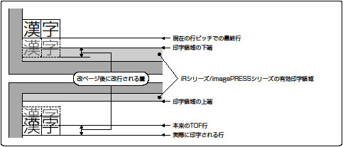 なお、改ページ後に残りの改行が行われた場合、印字データが有効印字領域の上端を越えると印字は行われません。