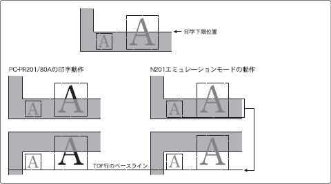 本エミュレーションモードでは、ページフォーマットに関わらず、縦倍文字が有効印字領域内に入っている場合は印字し、有効印字領域をはみ出す場合は、そのページに印字しません。