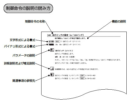 アプリケーションソフトウェアを使用して印字するときは、アプリケーションソフトウェア側で自動的にこの制御命令を送り出しています。独自に作成したプログラムで印字する場合は、本カテゴリに記載される制御命令の説明をご覧ください。