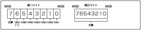2バイトのうち、第1バイトのビット1~6がそれぞれチャネル1~6に対応します。ビット7は、つねに『1』で、ビット8(最上位ビット)および第2バイトの各ビットは『0/1』のどちらでもかまいません。