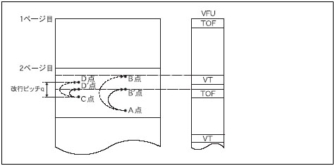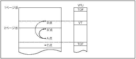 逆方向改行モード時、図のように現在印字位置がA点にあるとき、垂直タブの実行 VT を行っても前ページのB点には戻れず、B’点に移動します。
