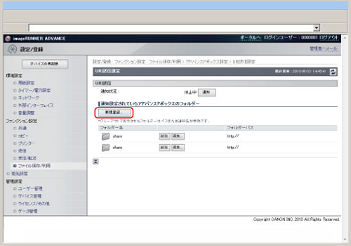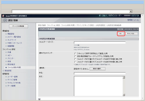 送信/転送機能を使用して、ループバックアドレス(ネットワーク上で自機を表すアドレス)から、アドバンスドボックス内の指定フォルダーへファイルが保存されるごとに通知します。なお、サブフォルダー内にファイルが保存されたときやフォルダーが追加されたときは通知しません。ループバックアドレスでの指定は、[スキャンして送信]や[転送設定]で本機のアドバンスドボックスを宛先にするときに使用します。(→アドバンスドボックスのアドレスを登録する)
