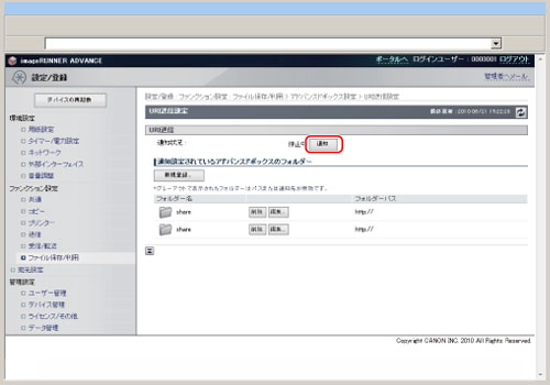 タッチパネルディスプレーの[スキャンして保存]から、アドバンスドボックス内の指定フォルダーへファイルが保存されるごとに通知します。なお、サブフォルダー内にファイルが保存されたときやフォルダーが追加されたときは通知しません。