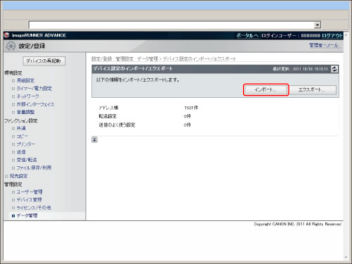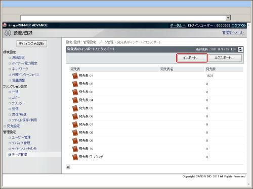 デバイス設定をインポートすると、宛先表も同時にインポートされ、登録されている宛先が削除されて読み込んだファイルの内容で上書きされます。