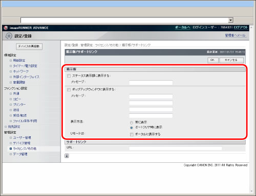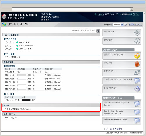 「掲示板」とは、管理者が本製品の使用者に知らせたいメッセージをタッチパネルディスプレーやリモートUI に表示する機能です。掲示板の表示法の設定やメッセージの入力はリモートUI から行います。