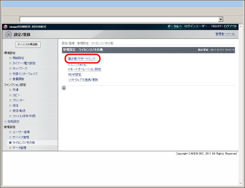 [設定/登録]をクリック→管理設定に表示されるメニューから[ライセンス/その他]を選択→[掲示板/サポートリンク]をクリック