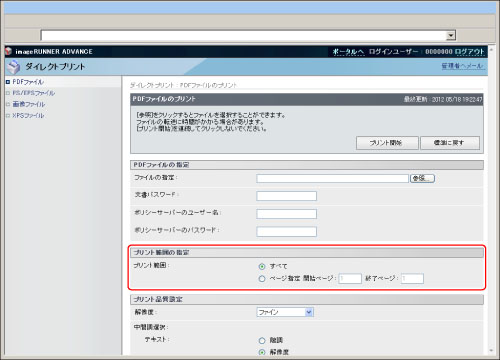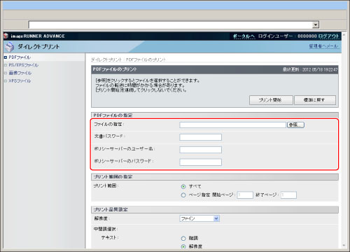 URLを指定してプリントするには、[管理設定](設定/登録)の[リモートUIのON/OFF]にある[参照印刷を使用]を「ON」にする必要があります。