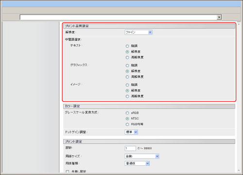 [解像度]は、テキストデータ等の輪郭がはっきりと見えるような精細な印刷を行うことができます。文字や細い線のデータなどをプリントするのに適しています。
