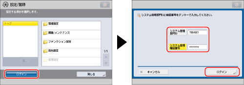本製品のログインサービスに部門別ID管理を使用している場合、一般ユーザーは設定/登録画面での操作を制限されます。設定/登録画面のすべての項目を操作するには、システム管理部門IDとシステム管理暗証番号を入力して管理者としてログインしてください。